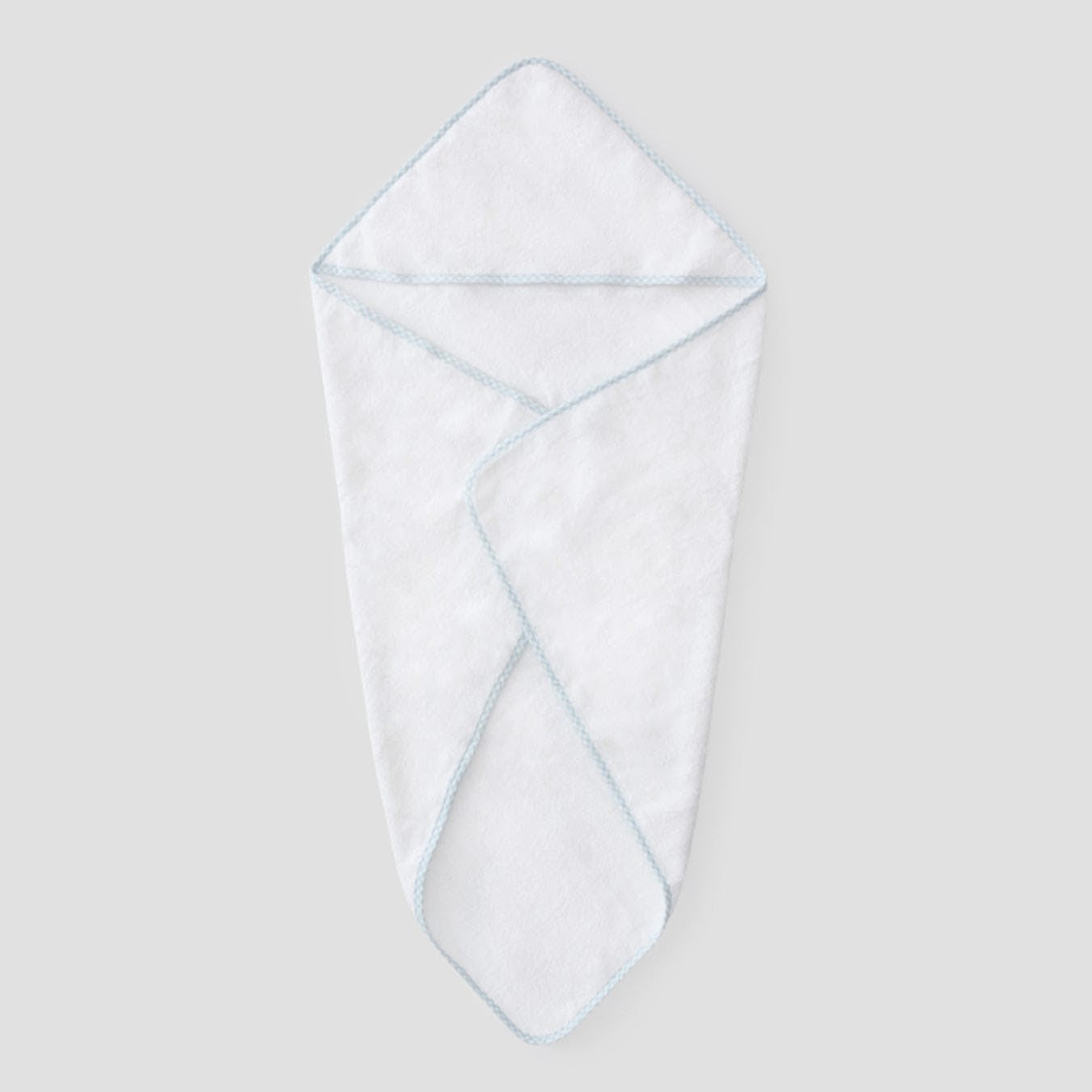 Features a corner hood and our signature piped edges. Light Blue Gingham on White. Made from soft to the touch organic cotton. Customizable with embroidery or applique for a personal touch.