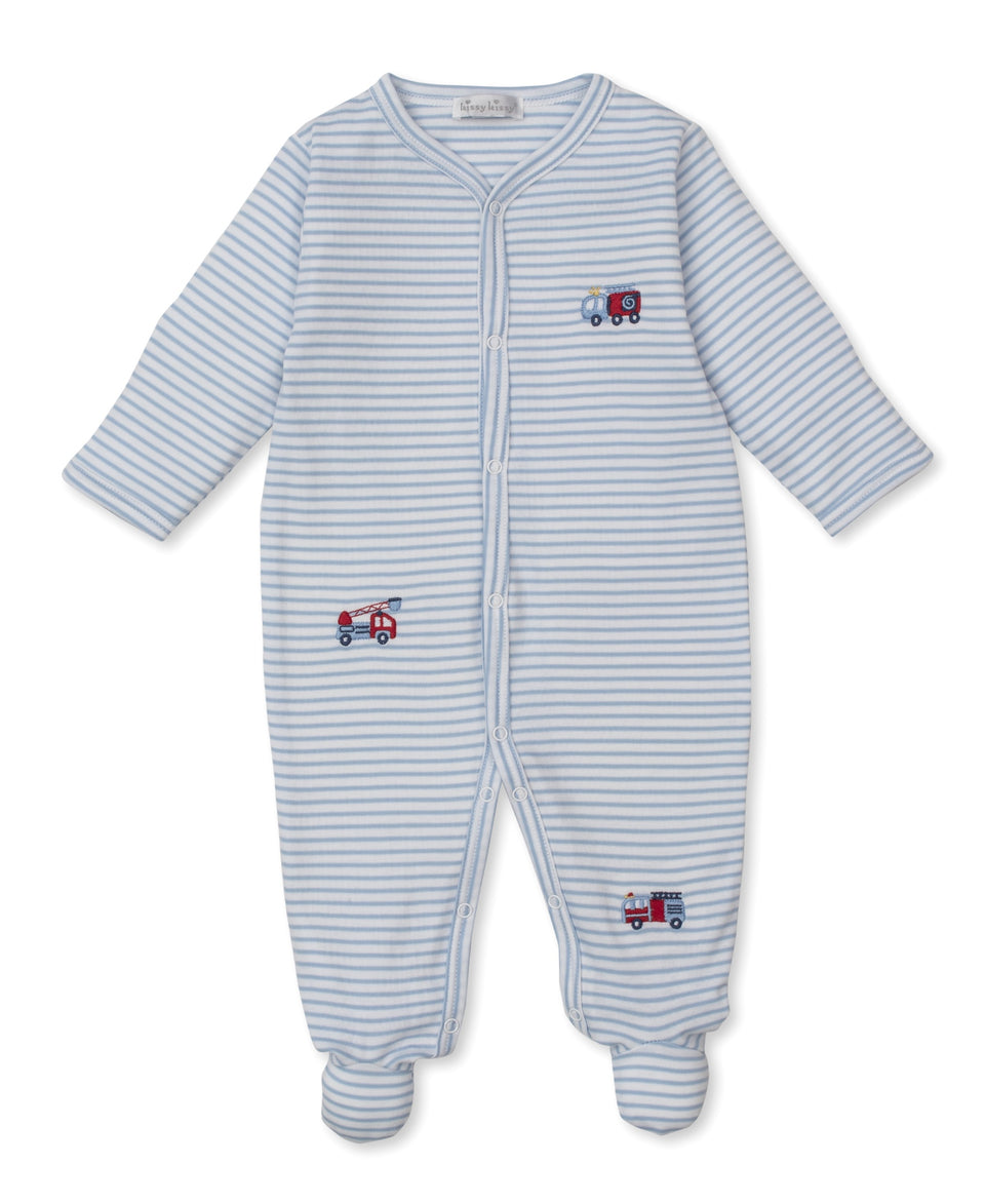 The Kissy Kissy Fight the Fire Playsuit is a charming firetruck-themed baby outfit, crafted from ultra-soft 100% Pima cotton for ultimate comfort.