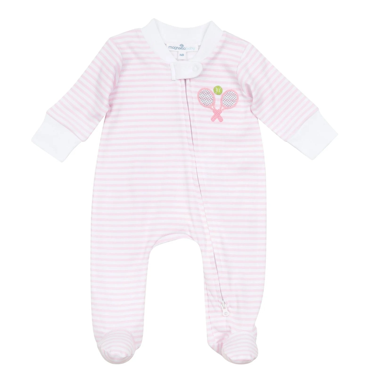 Love the game? Dress your little champion in our Courtside Cuties Applique Zip Footie in sweet pink stripes! This adorable footie is crafted from the softest Pima Cotton, ensuring your baby stays cozy and comfortable all day and night. The convenient two-way zipper allows for easy diaper changes, while the built-in footies keep tiny toes warm and snug.