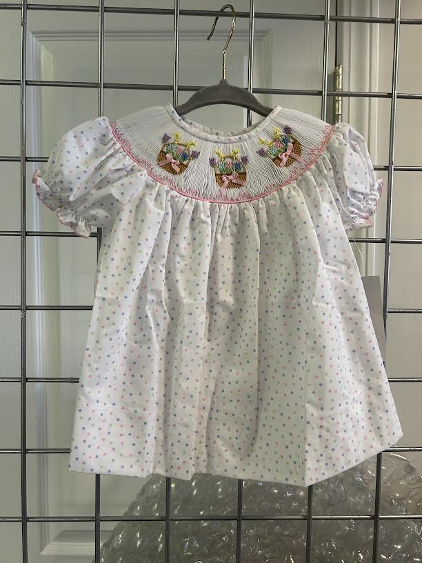 Polka Dot Smocked Bishop Dress w/Flower Basket