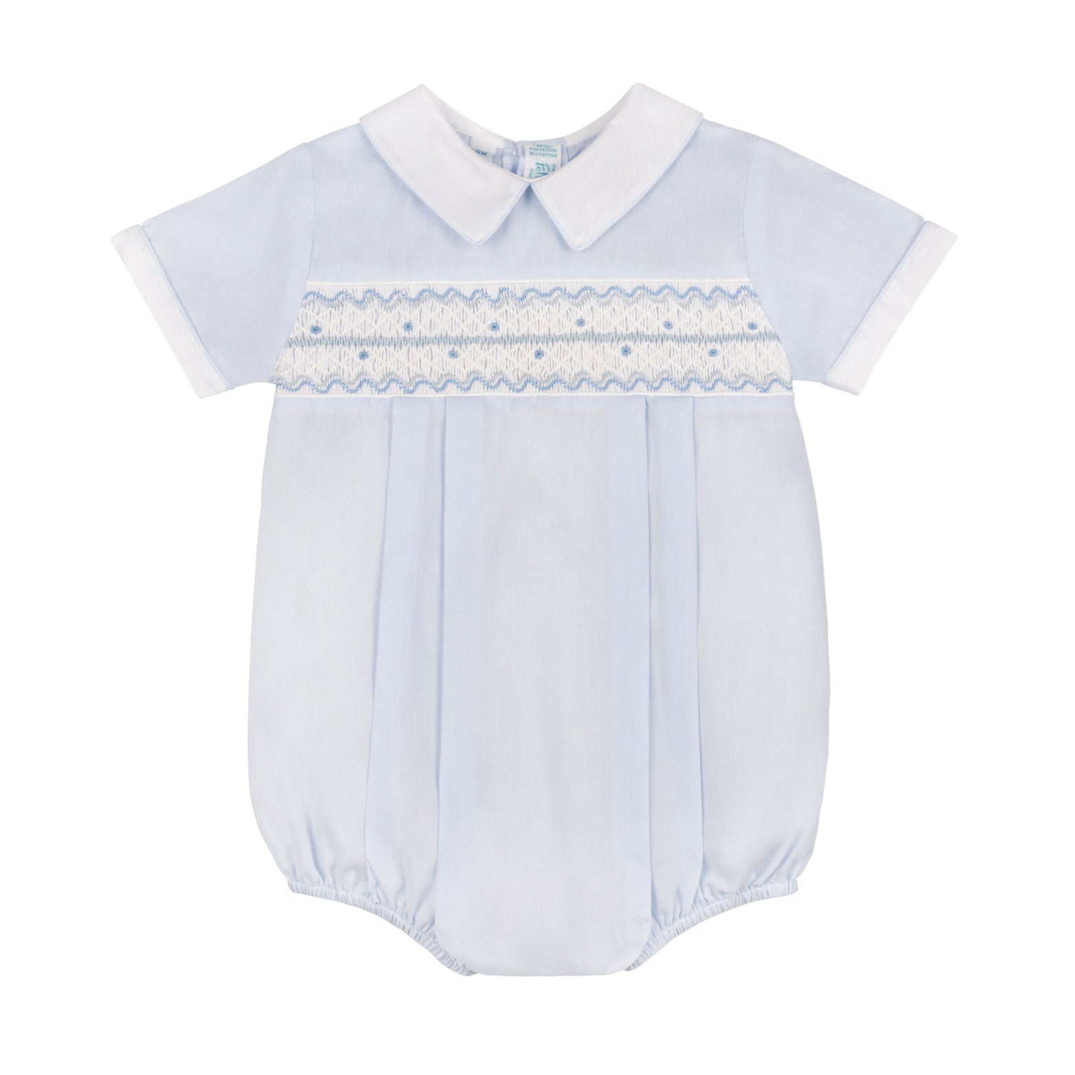 Description: This baby romper is perfect for spring! Intricate smocking and embroidery is all hand-stitched. Lightweight breezy cotton blend is perfect for spring weather. Add on a sweater for more chilly days!