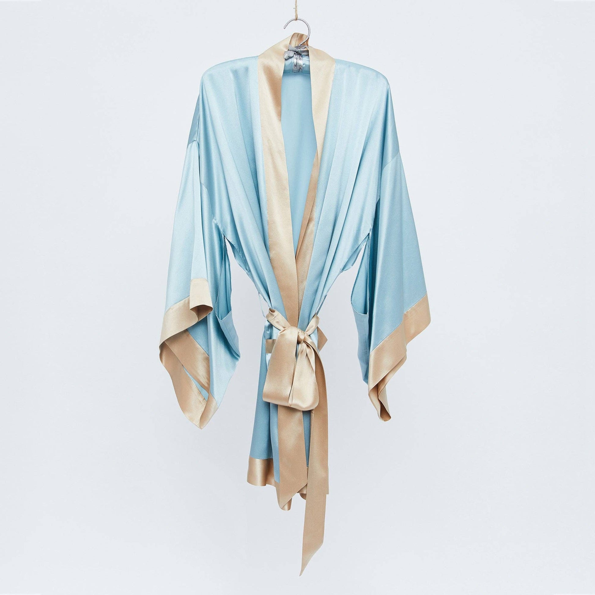 Sewn with intricate French seams and mitered-corners. Accented with a sash and pockets. With a matching silk hanger.
