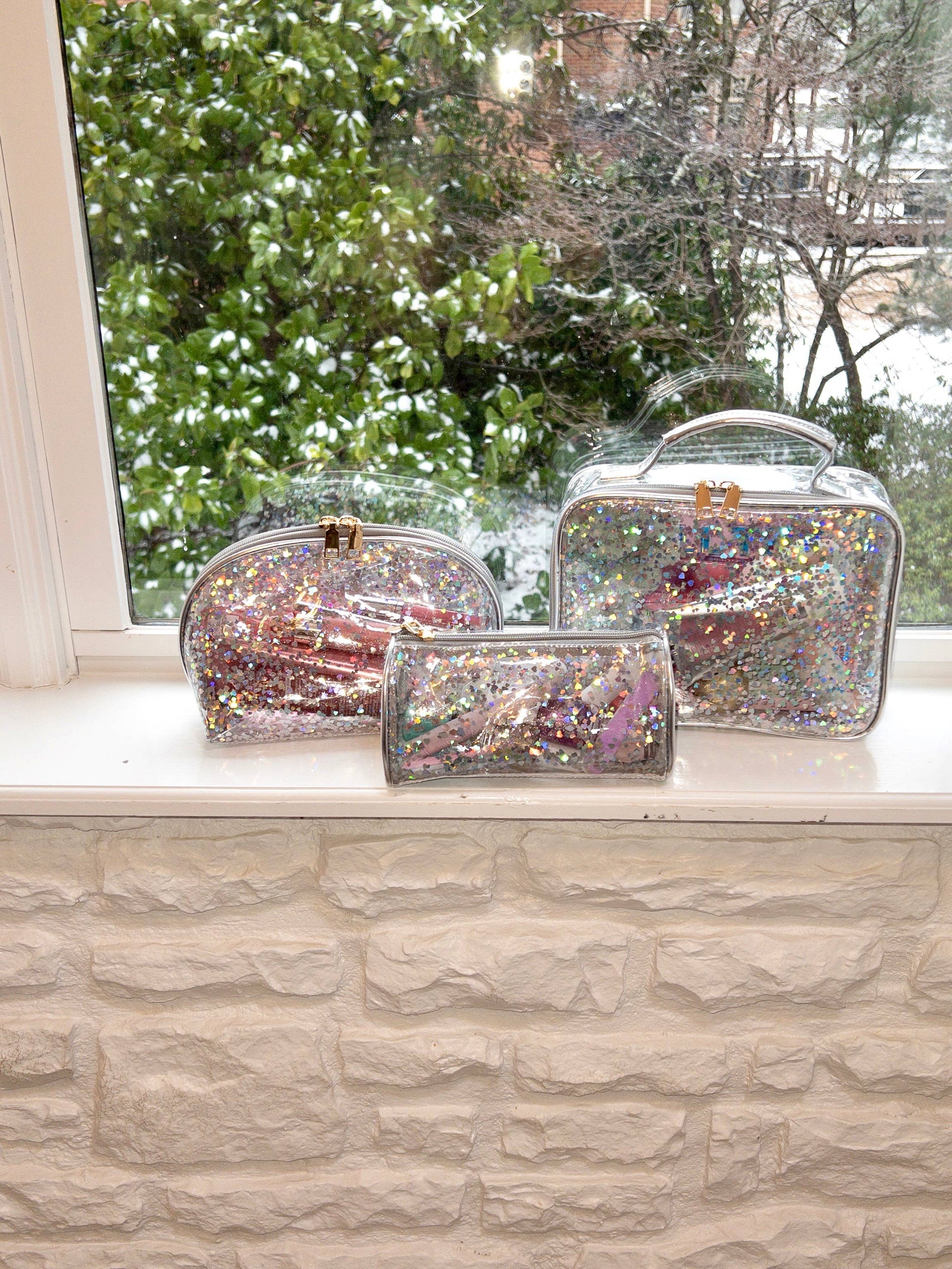 There are three styles in each trio that are different shapes and sizes to meet all of her travel needs. All three are piped in silver and filled with silver hearts that catch the light and shine beautifully. Large: 9.5" x 7.5" x 2.5" Medium: 7.5" x 6.5" x 4" Small: 7.5" x 4" x 3"