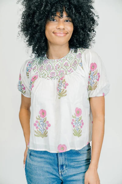 This Lacey Blouse features a contrasting print around the neckline, adding a touch of elegance to its relaxed fit and cuffed short sleeves. Perfect for a day to night look.