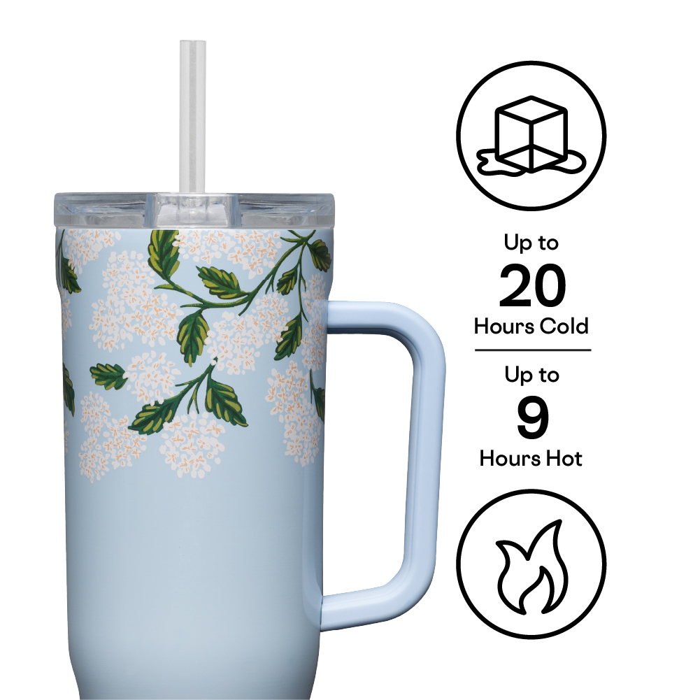 Let the joyrides commence. Cruiser, our largest straw cup to date, keeps 40 oz of your favorite beverage cold for up to 20 hours, allowing you to enjoy everyday adventures without giving your hydration needs a second thought. It features an exclusive dual-function sip + straw spill-proof lid, a comfy soft-grip handle, and a stay-put silicone bottom to keep it upright no matter your destination or how many stops you take on the way. Now available in three of Rifle Paper Co.'s iconic floral patterns.