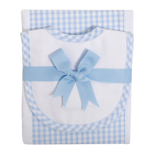 The popular newborn feeding set features a super absorbent burp cloth with a fabric panel sewn down the middle and a small bib backed with 100% cotton terry. This extra thick bib is the perfect size for little droolers and early feedings. This set comes tied with a gorgeous grosgrain bow; ready for gifting!