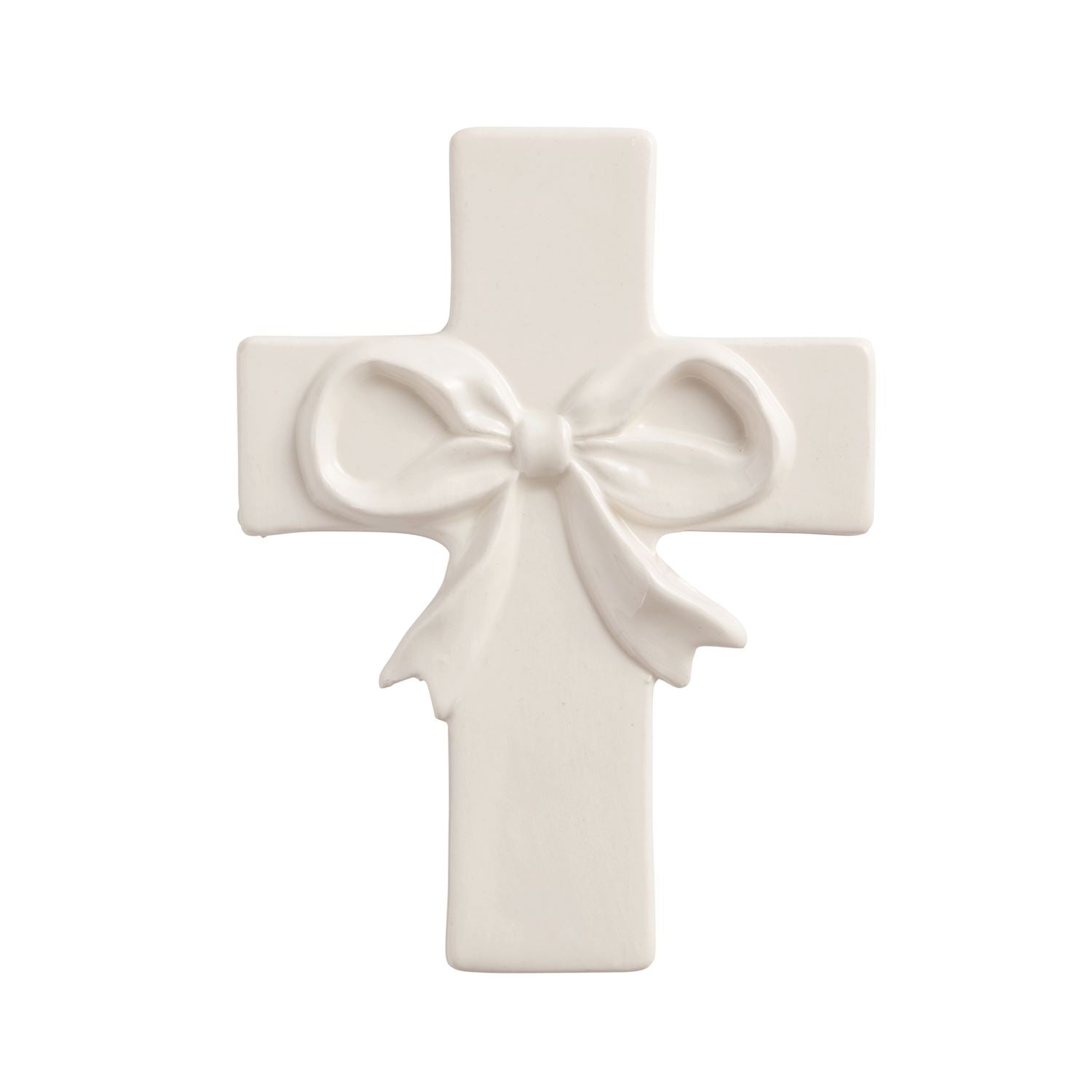 Ceramic cross features layered dimensional bow.