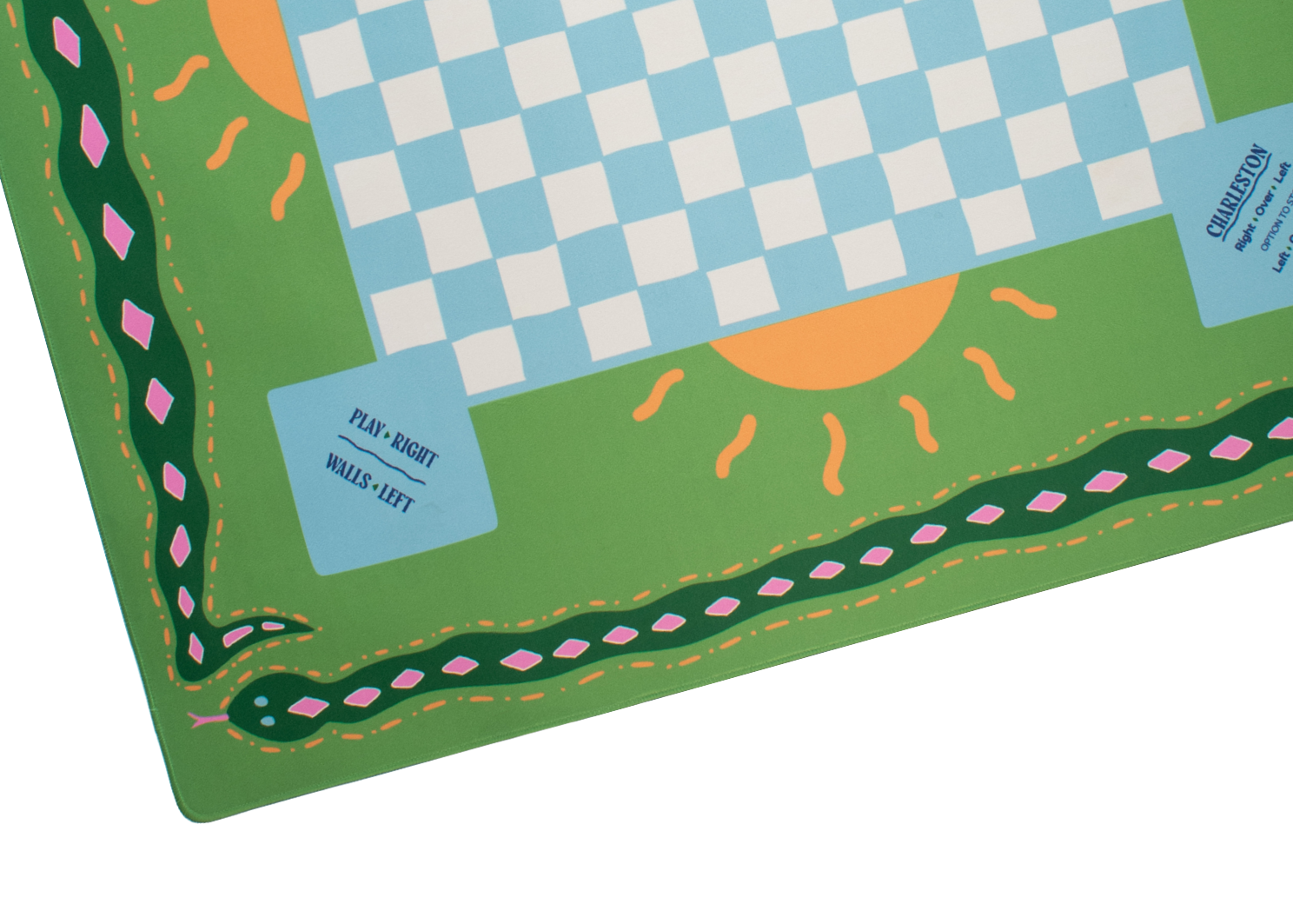 The Oasis Mat is a tropical, lively pairing for your Miss 🌴☀️ Mahjong Tile Set, featuring a vivid green snake border, hand-drawn blue and white checkerboard center, and golden suns.