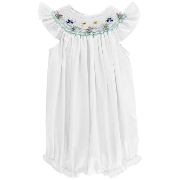 White Bishop Romper with Smocked Flowers