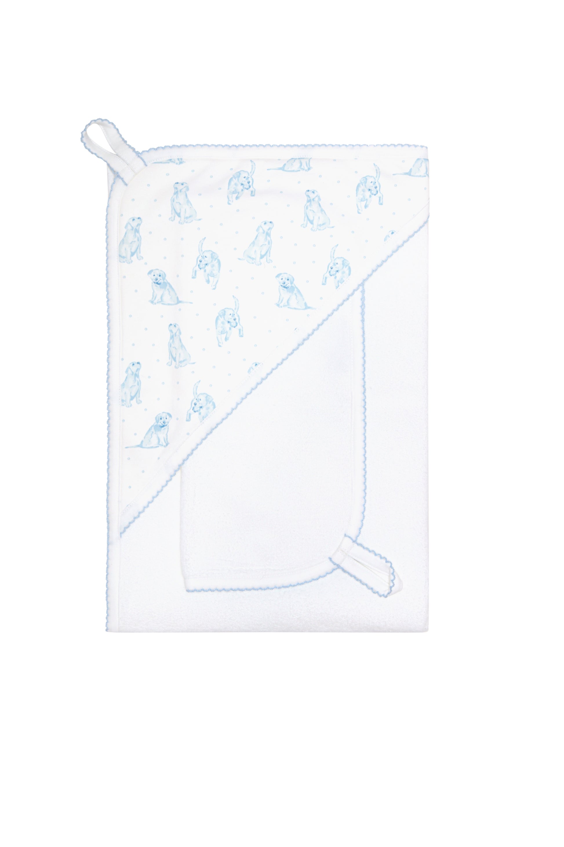 Our Toile Hooded Towel set is made of 100% Peruvian cotton. The hood has a pima cotton applique made of Blue Tolie fabric.