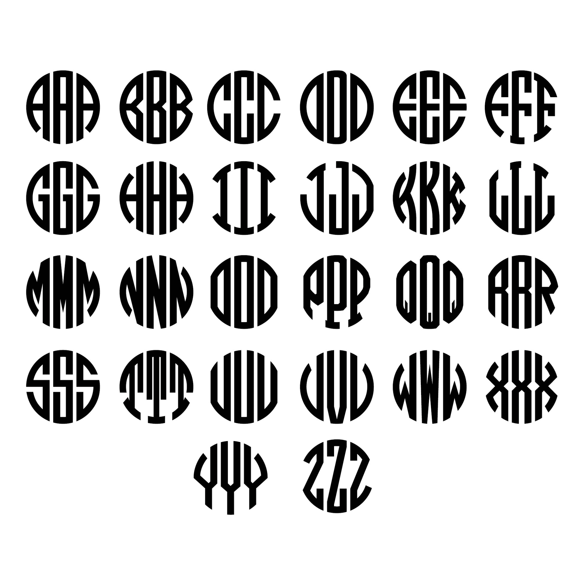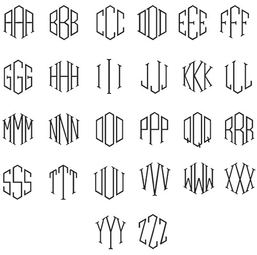 Examples below of Traditional Monogram Format – First Name Initial, Last Name Initial, Middle Name Initial