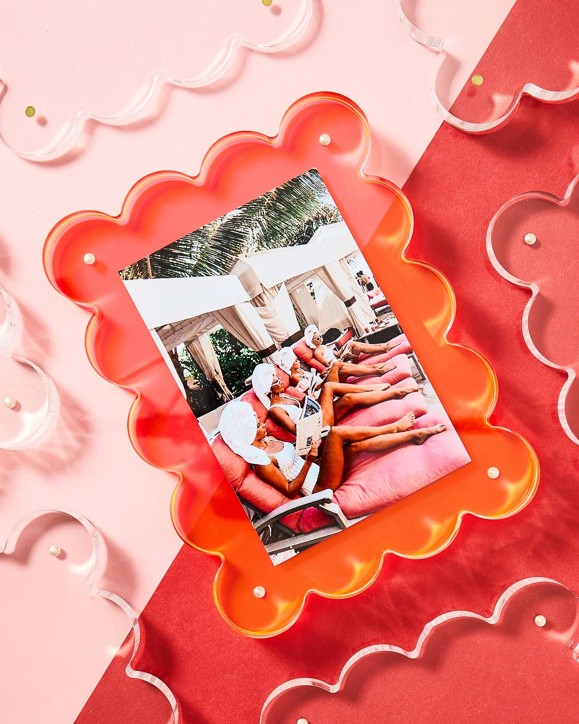 Display your favorite photos in style with this neon hot pink print acrylic picture frame! It features a magnetic border to securely hold your cherished pictures as well as adding a stylish touch. Perfect for giving your home a fun and unique look! 🤩 -