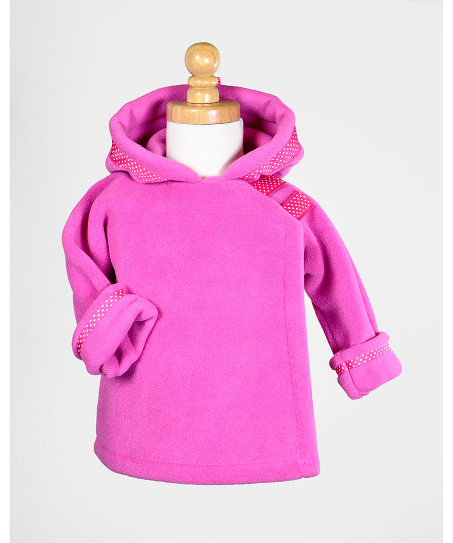 Widgeon’s classic Polartec fleece coat is possibly the best infant/toddler outerwear ever made. Flap-over-flap design has hook and loop close for easy on/off and double layer protection for the child’s chest area. The ingenious design allows for frustration free dressing and undressing. Grosgrain ribbon at the top of the hood provides a snug fit around the head on windy days. Made from Polartec® Classic 300 with DWR from Malden Mills to insure the best weight-to-warmth ratio possible. The rolled up sleeves and generous sizing allows for some growth before you need a bigger size. It has been a favorite baby gift for over 30 years! Add your own embroidery to create a very special giftable item. 100% Polyester. Machine Washable. Imported.
